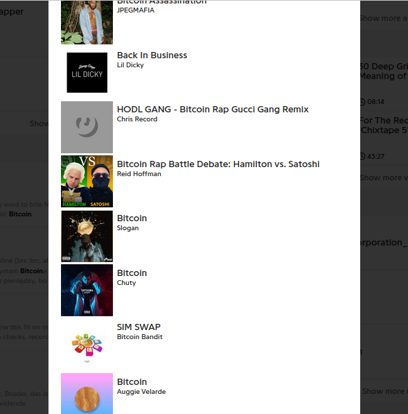 no, I don't, because no centralized platform has integrated bitcoin payments yet. such data doesn't exist. however, think about what you are asking. do rappers do this? rappers are people. people use bitcoin. they DEFINITELY rap about it at least