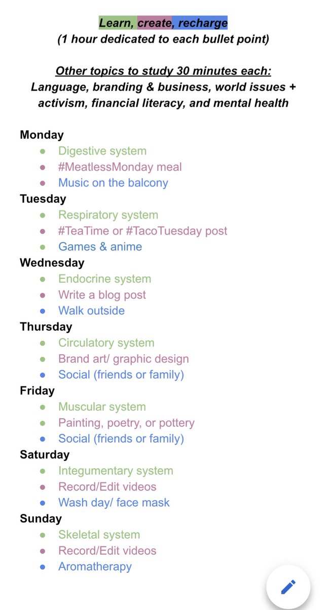 I have a system to help me focus on learning + creating something new each day, in addition to dedicating time to recharging my body + mind when I am done. LEARN, CREATE, RECHARGE.