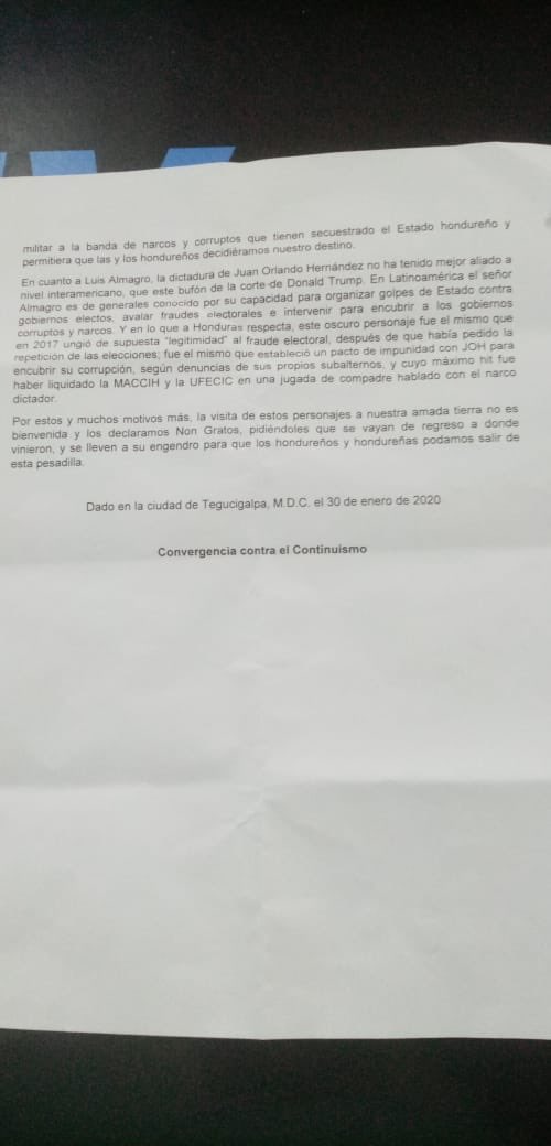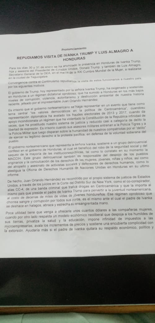 Today, a press conference at the airport and a protest gathering to resist the potential visits of Ivanka Trump and the OAS’s Luis Almagro to Tegucigalpa