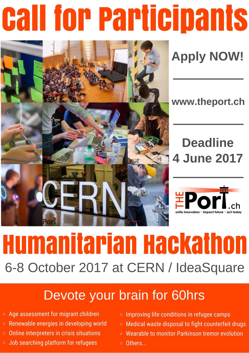 @theportatcern#Humanitarian#Hackathon (6-8th October 2017) enrollment open until June 4th. checkout http://theport.ch/ pic.twitter.com/nEsMOY33Bk