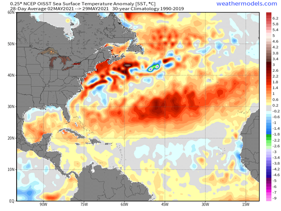 The subtropical Atlantic is much warmer than normal and tropical Atlantic is near average. The region with above-normal SSTs in Atlantic correlates fairly well with typical June SST pattern associated with above-normal