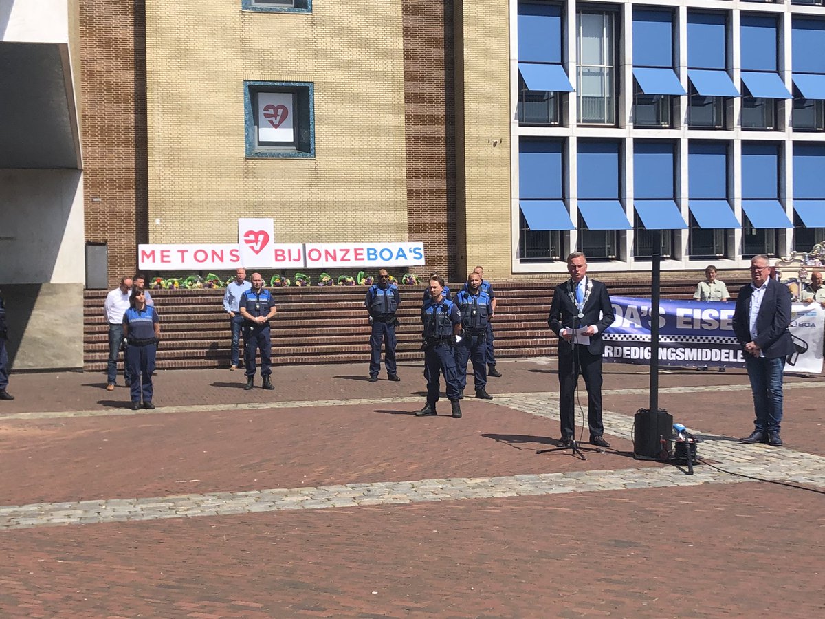 #Demonstratie van#BOA’s in#IJmuiden; zij willen pepperspray en een wapenstok om zichzelf te beveiligen tijdens het werk. Afgelopen Hemelvaart ging het in IJmuiden mis, vier BOA’s werden door jongeren geslagen en geschopt.#hvnl pic.twitter.com/xlogfSzPYi