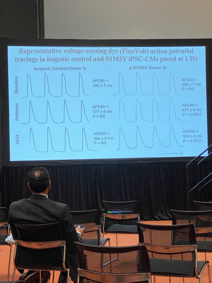 @SKHamrick27 on her first ever national/international abstract presentation today @HRSonline. Samantha, you did a great job showing the APD90 prolonging effect of acidosis or#hydroxychloroquine on heart cells w/ S1103Y! pic.twitter.com/9DIq5Csw1N