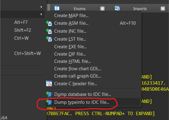 Got a new version of A Thing and need to migrate your types between IDBs? Want to share your meticulously crafted structs but not your IDB? Try dumping the typeinfo! - Export: File -> Produce File -> Dump typeinfo to IDC file... - Import: Alt + F7 -> select your IDC!