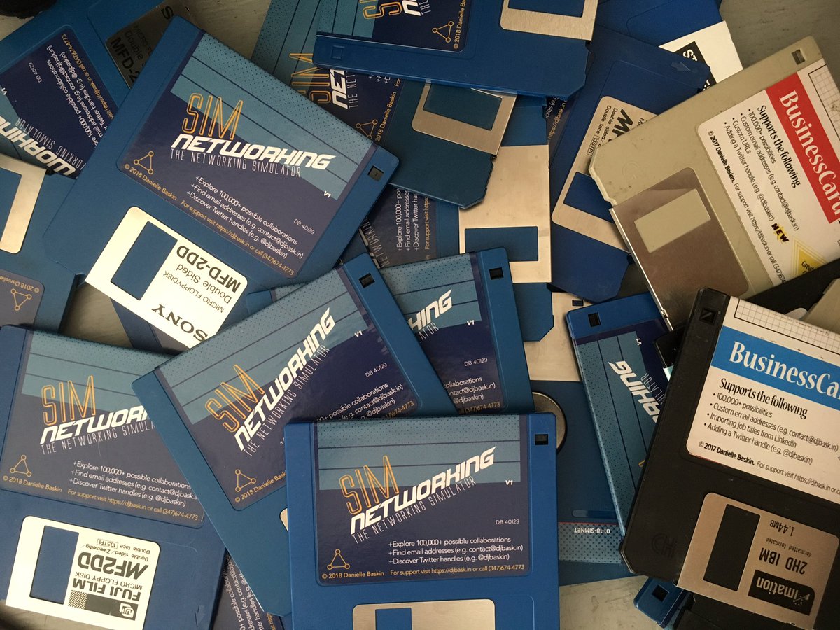 Made new business cards for the Immersive Design Summit — if anyone has a floppy disk drive, each disk has a mystery on it.
