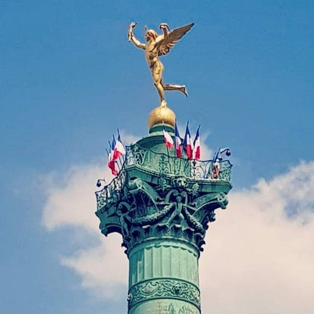 July Column (French: Colonne de Juillet) in the Place de la Bastille. It was inaugurated July 28, 1840 and continues to stand tall.