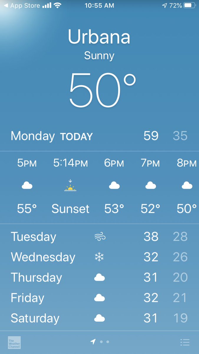 Will get up to near 60°F today; accumulating snow likely Wednesday. Gotta love it lol!