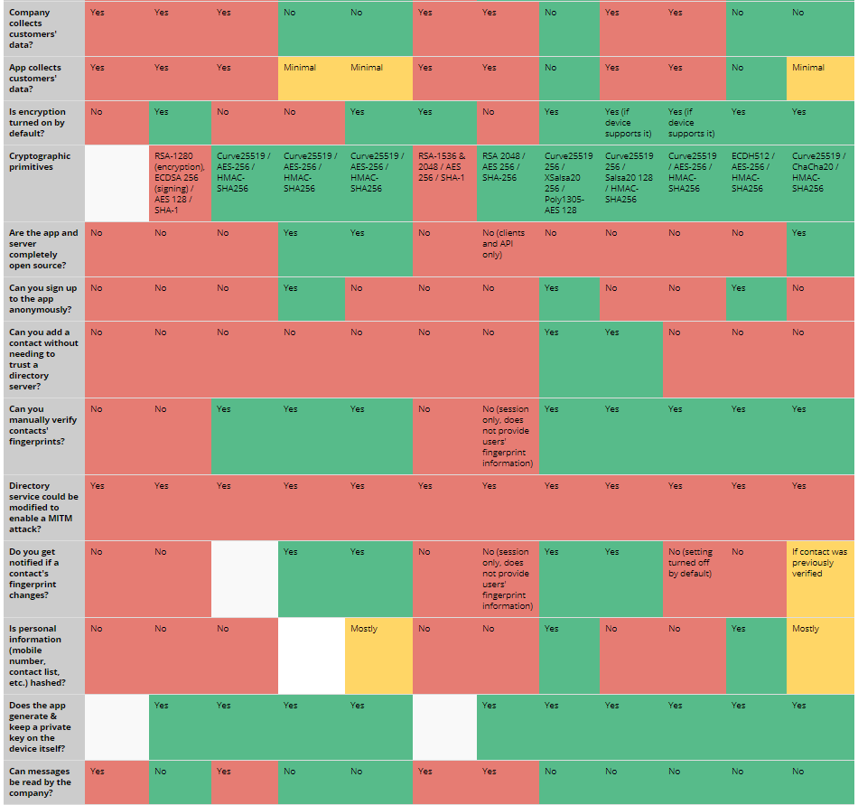 Después de la polémica sobre el uso de las de #apps de mensajería en las organizaciones, adjunto una comparativa en términos de seguridad y privacidad:#Allo#iMessage#Messenger#Riot#Signal#Skype#Telegram#Threema#Viber#Whatsapp#Wickr#Wire