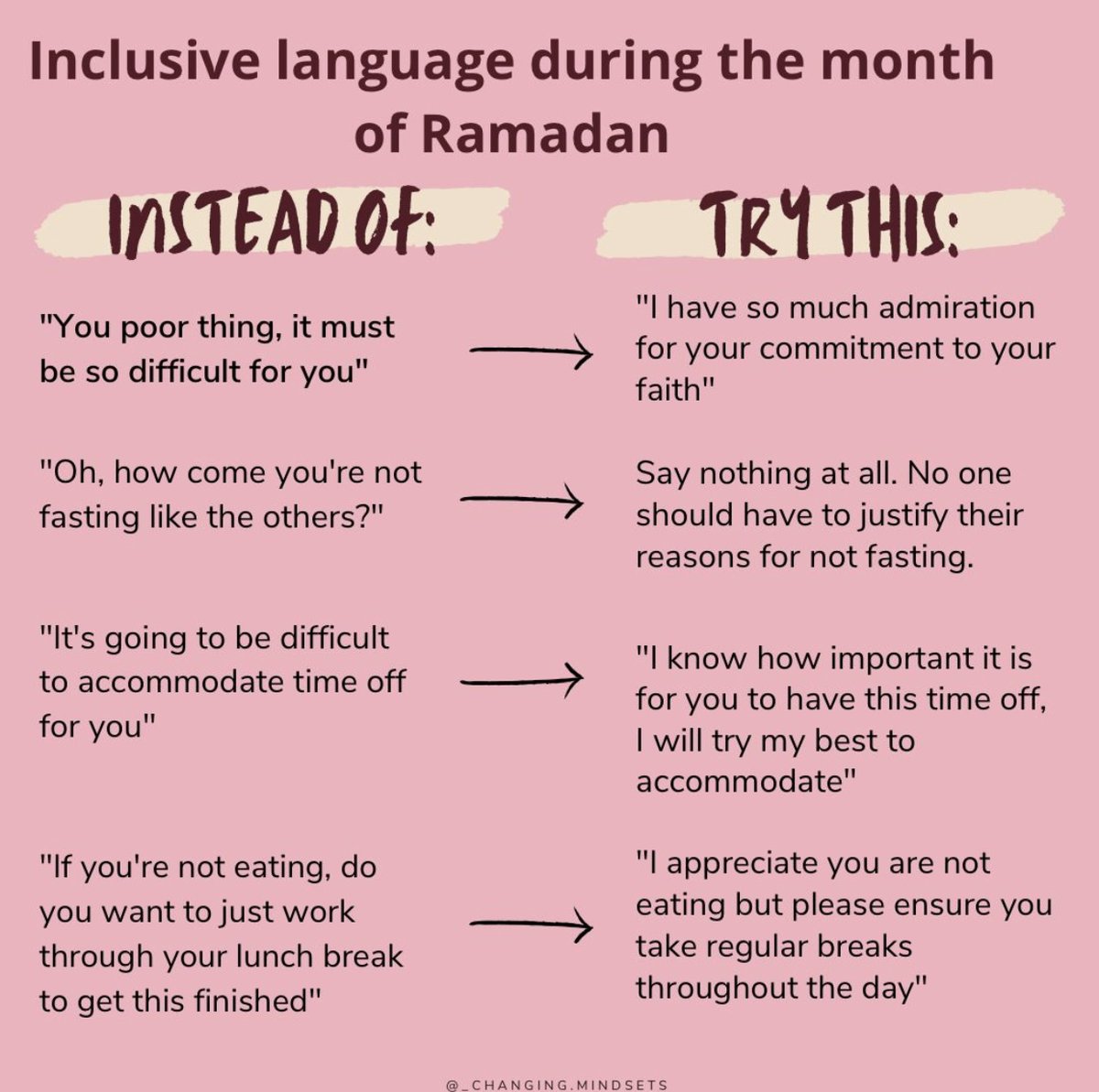 #Ramadan is under two weeks away & I wanted to highlight the importance of inclusive language when communicating with your#Muslims colleagues. I know, most of the time, when people say things, the intent isn’t bad but it can come across negatively. Here’s some tips.#Inclusion pic.twitter.com/4YpXNRPH3A