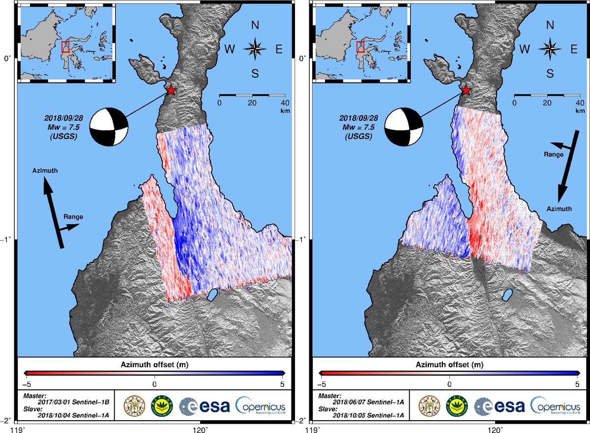 Surface deformation of Palu fault during the 9/28 Mw 7.5 earthquake. Information derived from Pixel Offset of Sentinel-1 radar images. Both ascending and descending track images show similar results and magnitude of motion. With
