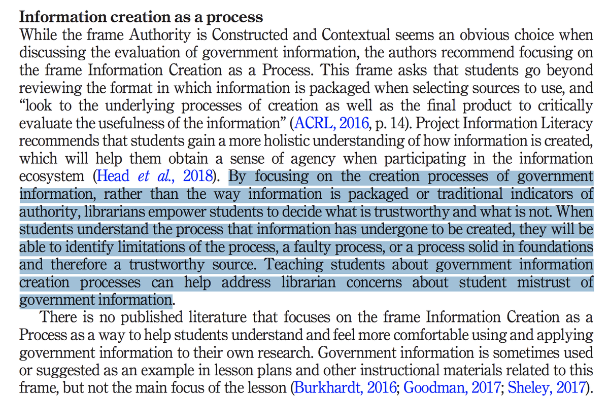 The proof is in the process : Fostering student trust in government information by examining its creation https://www.emerald.com/insight/content/doi/10.1108/RSR-09-2019-0066/full/html … Very interesting article by