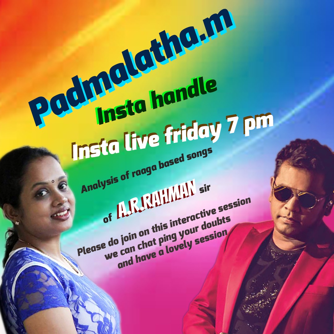#instalive this Friday at#7pm on padmalatha.m.Would be analysing raaga based songs of@arrahman sir .Please do join and ping your requests and doubts too .Looking forward !#instalive#Friday#7pm#arrahman#iravinnizhal#maayava#99songs#Mimi#raasali#isaipuyal !pic.twitter.com/X9FqXurdQU