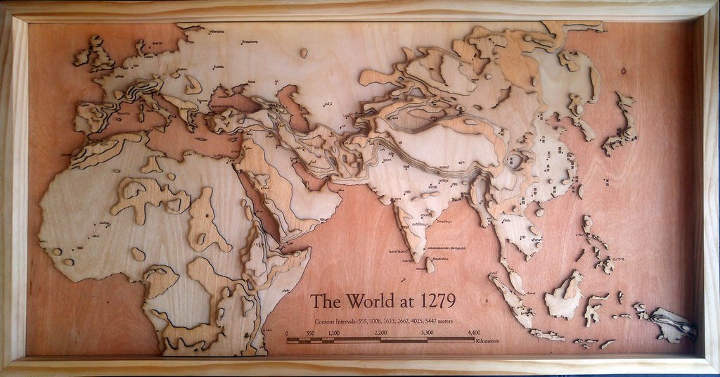 A 3D topographic wood map of the World at 1279, LASER cut, hand assembled. Made out of 1/8" birch plywood. City names are engraved in the native language. Each contour interval represents elevation