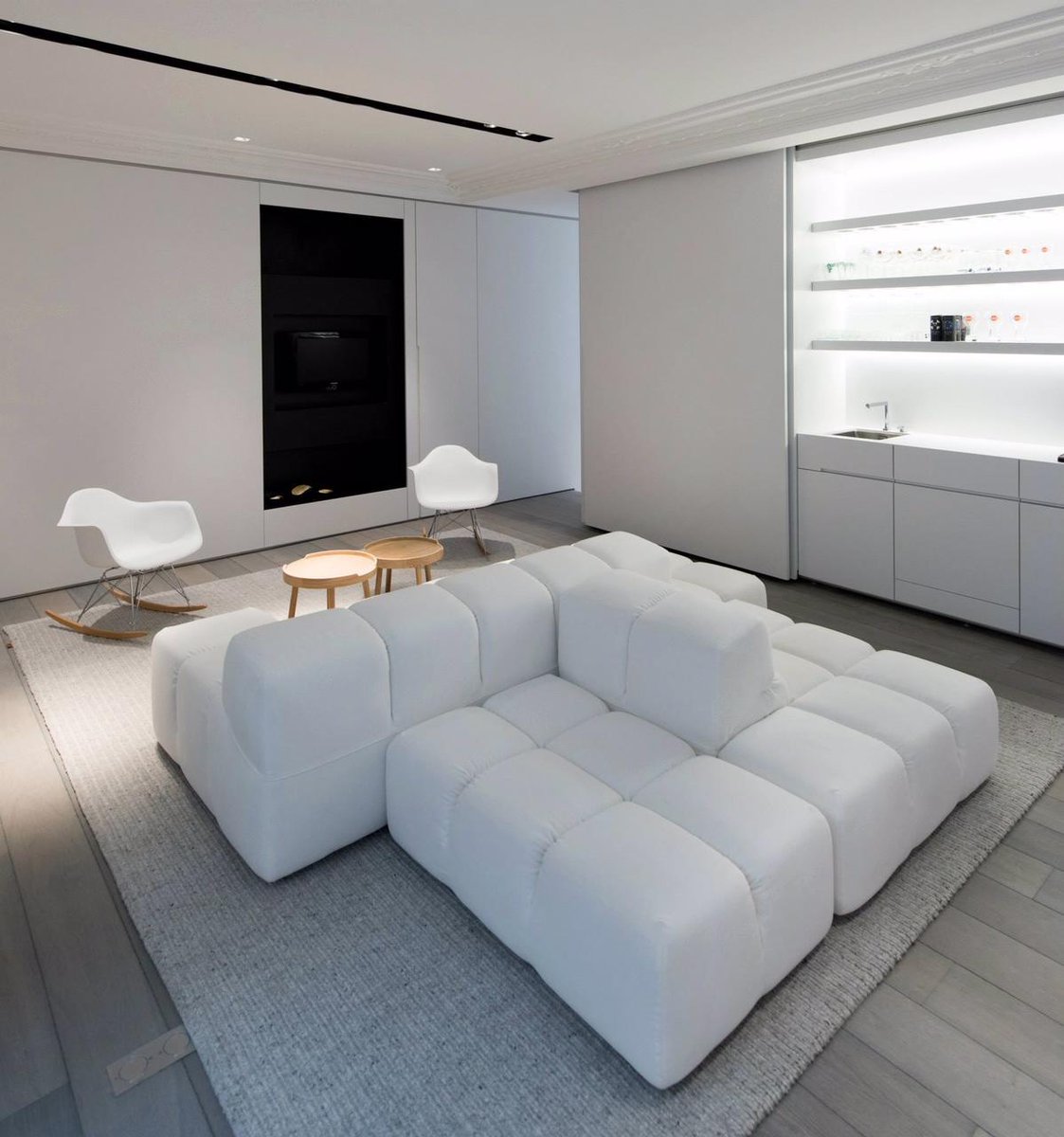 Earthy, muted tones combined with contemporary furniture units make for cosy