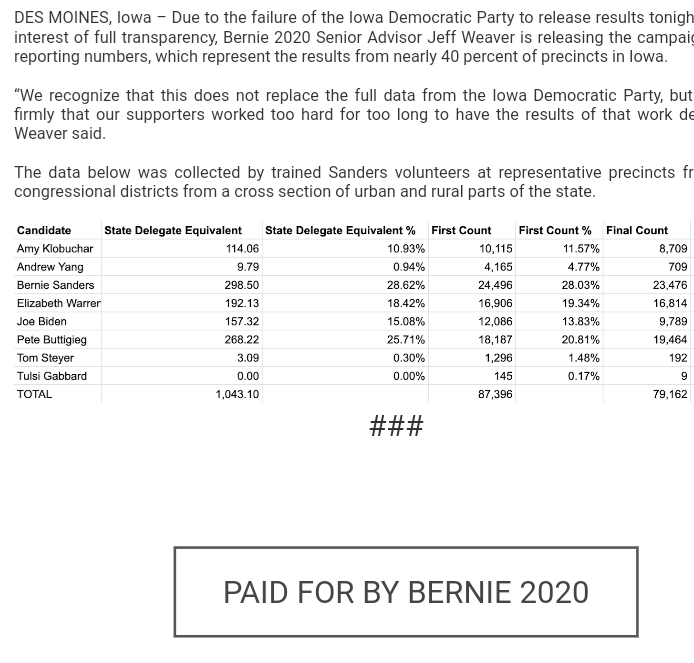 @BernieSanders#BernieSanders#Presidential#campaign & their#internal#IowaCaucus#iowacaucus2020 results @ sites in#iowa#IowaCaucusDay they say. NO surprise...#BernieSanders won the#democratic#iowacaucus2020 by 2-3% &#PeteButtigieg is in 2ndpic.twitter.com/wmyoZbyiYk