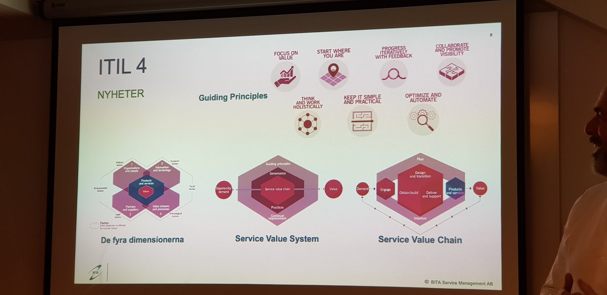 #ITIL 4 på Bita! New: Service Value System - Practioner 9 principles - 7 generic principles Service Value chain - Plan - Improve - Engage - Design and transition - Obtain and build - Deliver & support Value streams - ways through activities Collaborate & improvement visibility pic.twitter.com/ieZpwCACFj