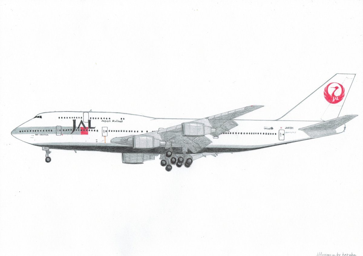 JALの747-400Dを2代目鶴丸塗装で描きました。JALは国内線用に747-400の短距離型であるー400Dを1991年から導入しました。国際線用のー400と共に「スカイクルーザー」の愛称が与えられ、羽田を拠点に伊丹、新千歳、福岡、那覇といった花形路線に投入されました。 JAL 747-446 JA8084