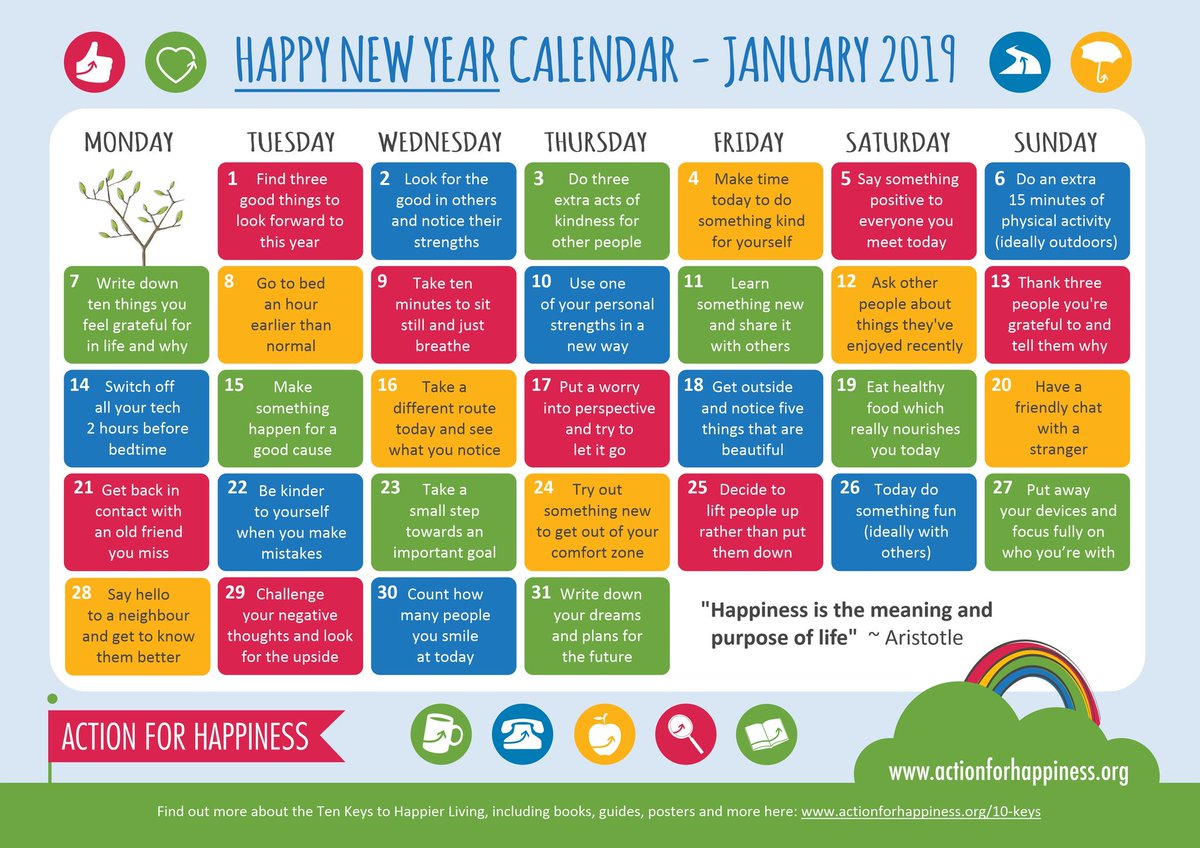 @actionhappiness#January calendar. New years resolutions can sometimes feel too big and far off. Why not try some of the suggestions here? Small & achievable with the feel good factor