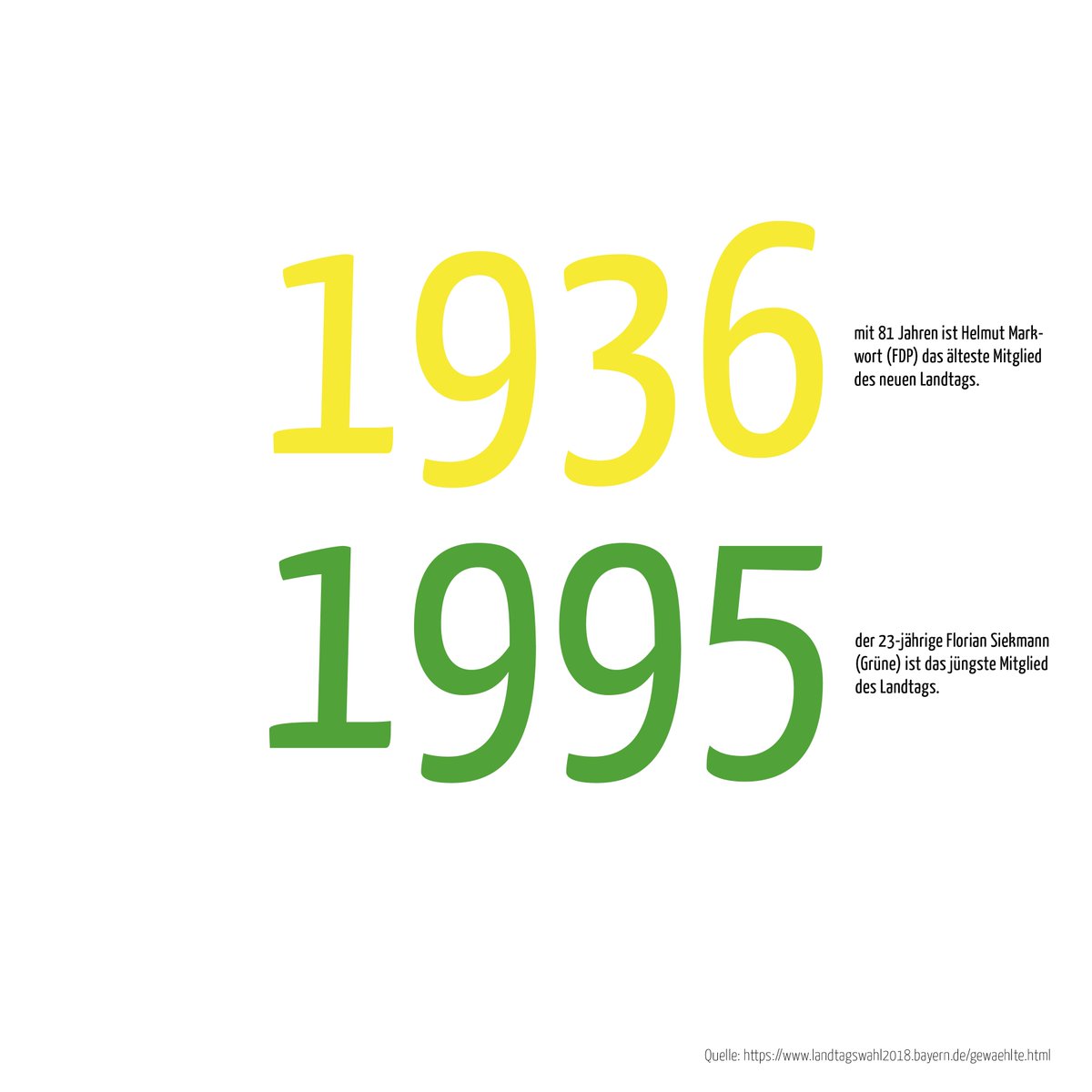 #Landtagscheck Nr.3: Das jüngste Mitglied des@Landtag_Bayern ist@FloSiekmann /@GrueneLandtagBY (23) . Das älteste Mitglied des Bayerischen Landtags ist @HelmutMarkwort /@fdpbay (81).#Generationengerechtigkeit#jetztistdiezeit pic.twitter.com/NjVLpq5iWm