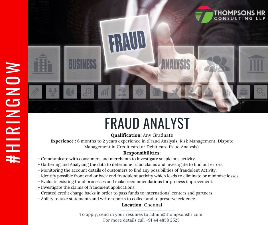 #JobAlert: We are looking for Executive/Sr.Executive#FraudAnalyst & Investigation,#InvestigationAnalyst,#RiskSpecalist for Banking and Financial industries in#Chennai Location. Reach us at admin@thompsonshr.com if you or any of your friends are interested.#HiringNowpic.twitter.com/lRdKQAjN6w