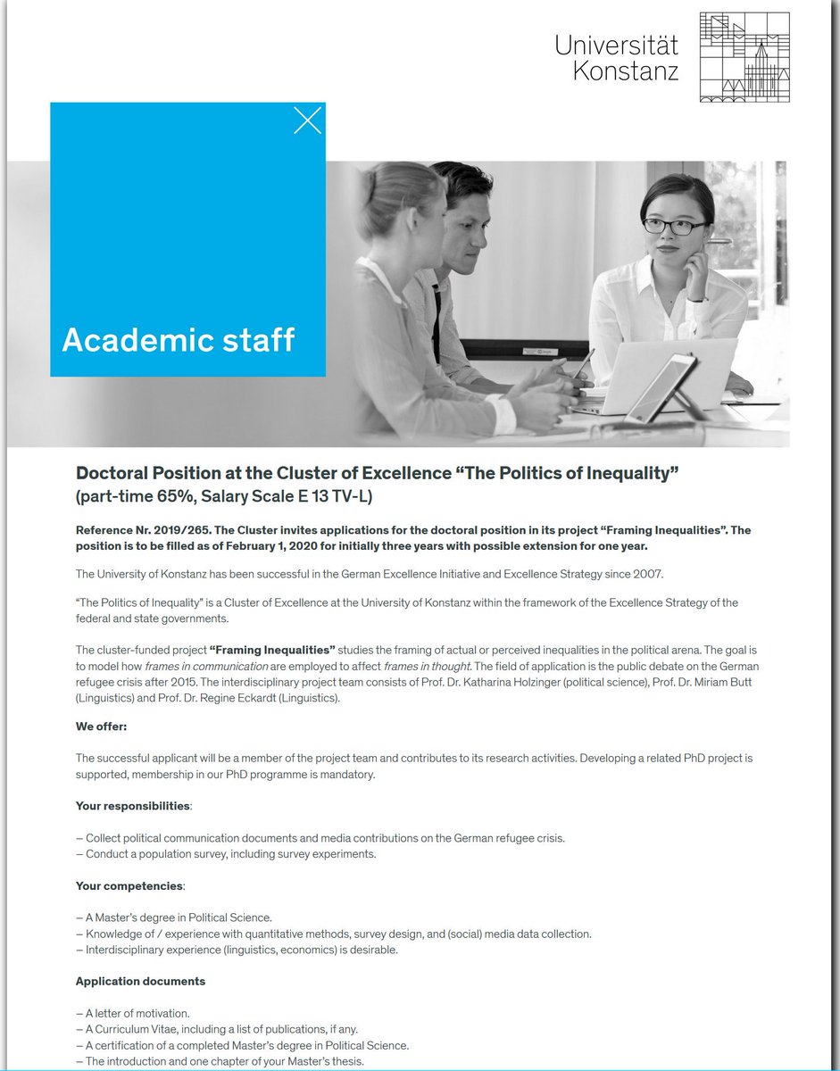 Job opening, please RT far and wide! We are looking for a Doctoral Student (65%, E13 TV-L), duration 3+1 years, in the Cluster project "Framing Inequalities"