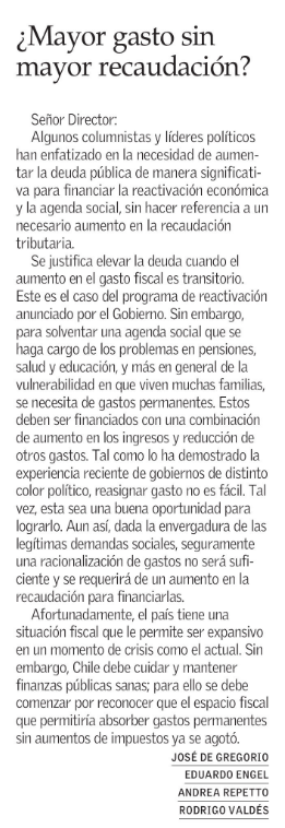 "Para solventar una agenda social que se haga cargo de los problemas en pensiones, salud y educación se necesita de gastos permanentes" afirman nuestros directores #AndreaRepetto,#EduardoEngel y#JoséDeGregorio, y llaman a aumentar la recaudación en la#ReformaTributaria.pic.twitter.com/FuJE3kMVH6