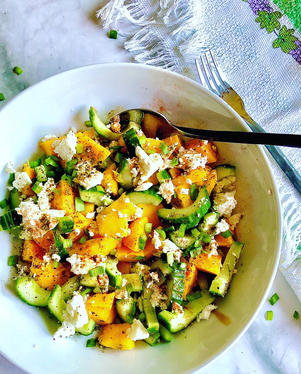 A vibrant salad with some amazing flavors to brighten up your weekend! Mango and cucumber with a dash of balsamic vinegar, magic ingredient za’atar-an earthy zingy middle eastern spice, lime juice, brown sugar and s&p. Topped with crumbled feta and chives.