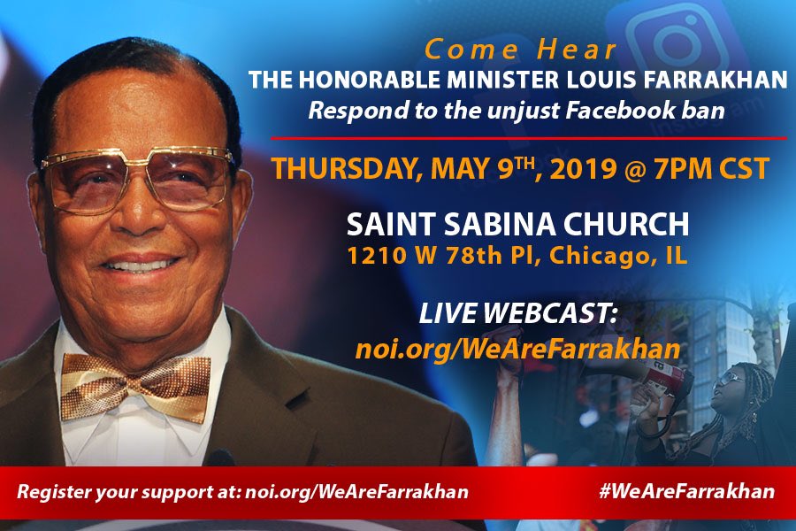 @LouisFarrakhan Speaks Today on the@facebook and@instagram Ban Thursday, 5/9/19 7PM CDT | 8PM EST@stsabinachurch @ http://noi.org/WeAreFarrakhan#Farrakhan#WeAreFarrakhan#JusticeOrElse pic.twitter.com/of0gdqGo6U
