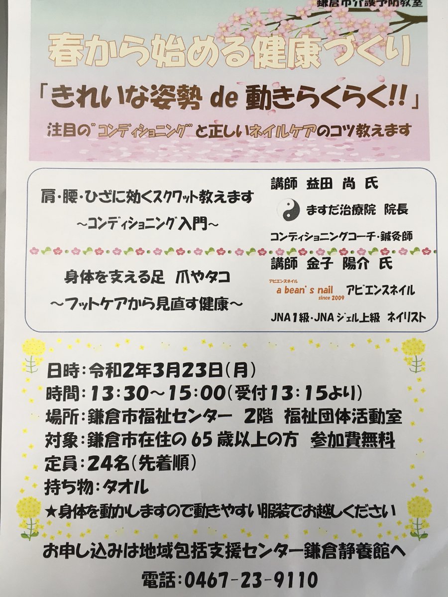 高齢者いきいき課 地域包括支援センター鎌倉静養館では、3月23日(月)13時30分~、鎌倉市福祉センターで介護予防教室 春から始める健康づくり「きれいな姿勢de動きらくらく!!」を開催します。対象は65歳以上の方。お申込みは地域包括支援センター鎌倉静養館へ℡0467(23)9110へ。