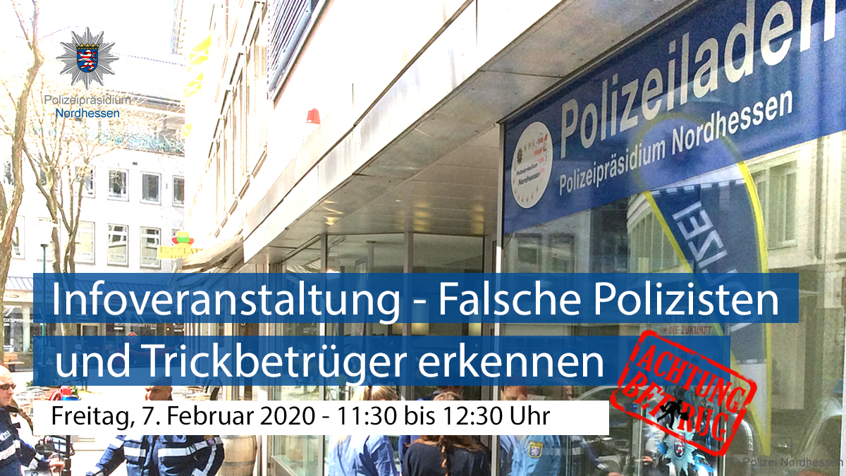 #Polizeiladen#Kassel: "#FalschePolizeibeamte#Enkeltrick & andere Trickbetrüger erkennen." Unsere Experten für Prävention laden alle Interessierten zu einem kostenlosen Vortrag ein. Freitag, 7. Februar 2020, 11:30 - 12:30 Uhr.