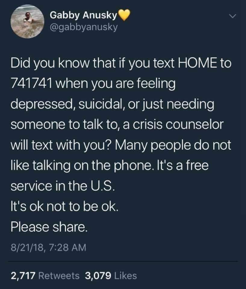 Crisis counseling by text message: US 741741 UK 85258 Canada 686868