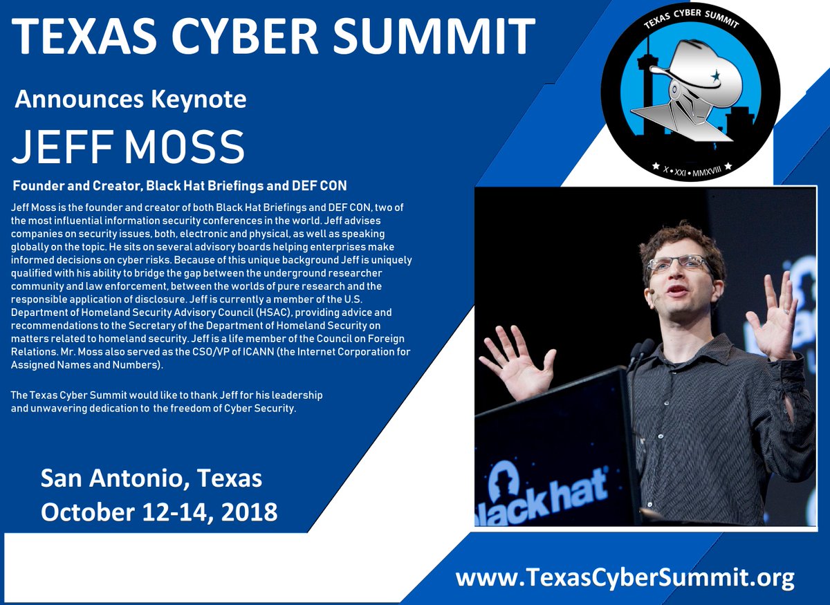 #TexasCyberSummit is honored to announce#keynote speaker@thedarktangent Jeff Moss Founder and Creator of@blackhat and@defcon#Cyber#Security#Expert and Legend#JeffMoss#TCS2018 http://TexasCyberSummit.org October 12-14th 2018 San Antonio TXpic.twitter.com/tKSeMgTNbp