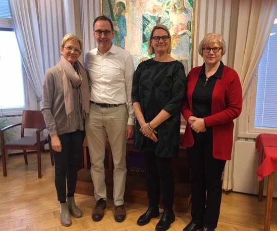 Näin Myrskylässä! Hanna (ent. Sariomaa) ja Nick Groos ovat lahjoittaneet Myrskylän seurakunnalle 30.000 euroa kirkon välikaton maalaukseen! Kuvassa vasemmalta kirkkoneuvoston vpj Päivi Viren, Nick ja Hanna Groos ja oikealla srk:n talouspäällikkö Anne Anttila.