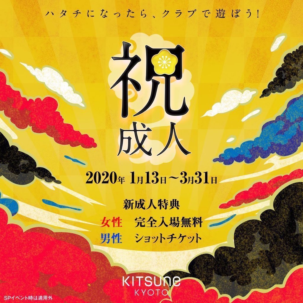 【2020.01.13(Mon)〜03.31(Tue)】 ハタチになったら、クラブで遊ぼう! 初めてのクラブはKITSUNE KYOTOで!今年も新成人のお客様にはお得に遊べる特典をプレゼント! 皆様のご来店お待ちしております!