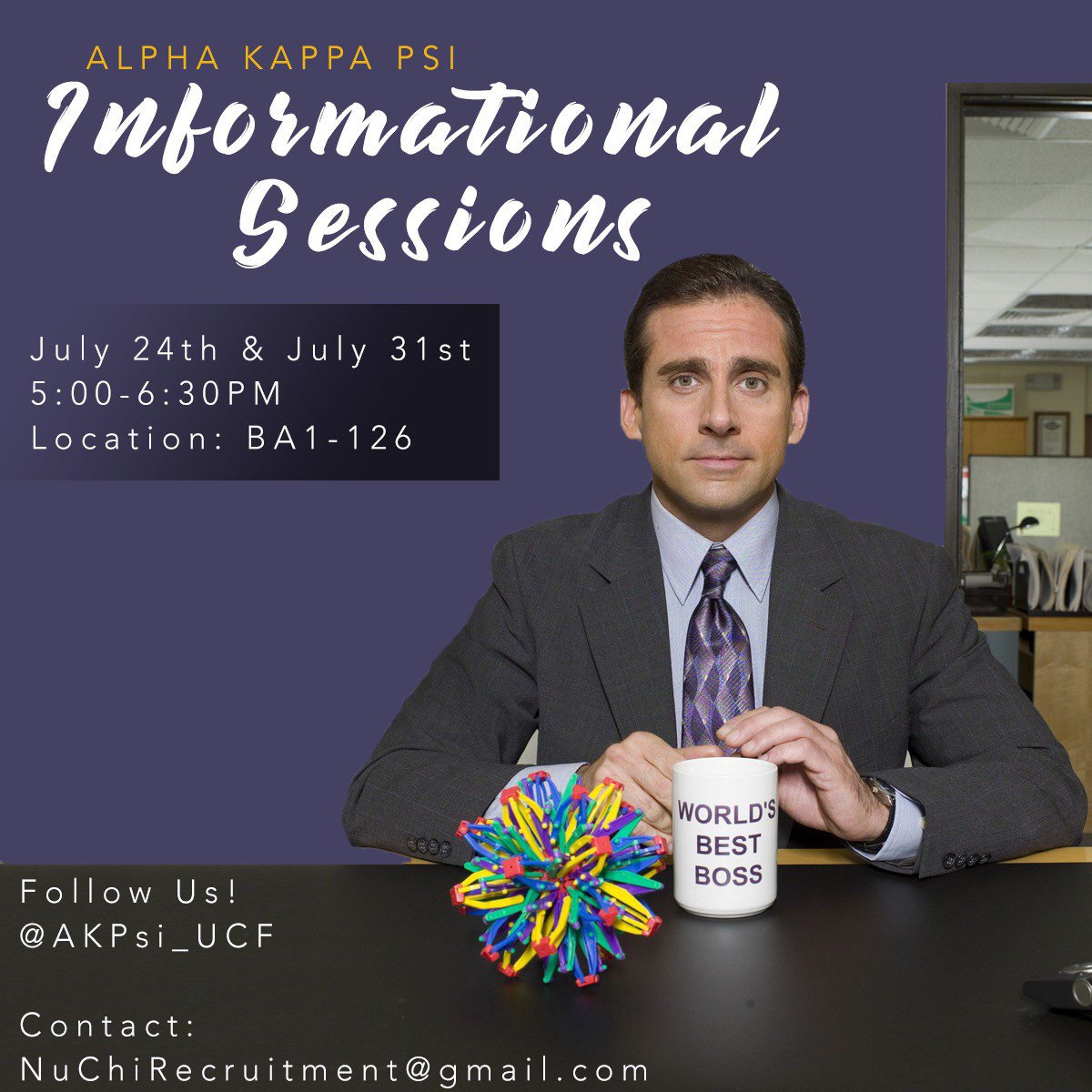 Hello Everyone! Are you interested in learning more about AKPsi? Then come out to our upcoming informational sessions. We’ll be giving information about our fraternity and our upcoming Fall Rush