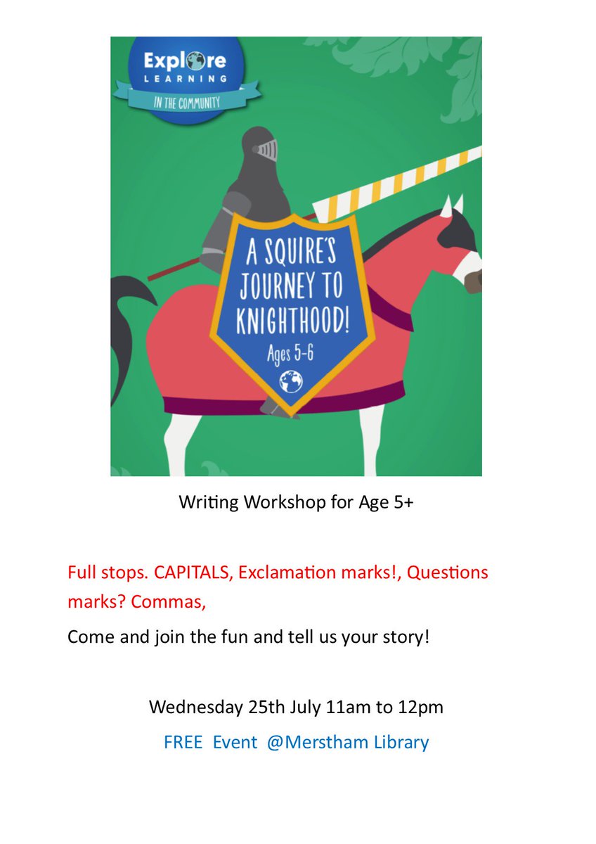 #squires#knights#queens#damsels#dragons to join#writing workshop for age 5+ Wed 25th 11am@MersthamLibrary with@exploretutors#loveyourlibrary#lovetoread#lovetowrite#powerofwords#SummerReadingChallengepic.twitter.com/LffAkf7SRI