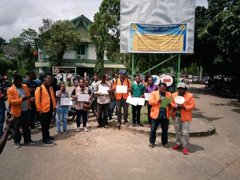 kedatangan Presiden Jokowi ke Kota Jayapura, Senin (1 April 2019) disambut aksi Mahasiswa USTJ