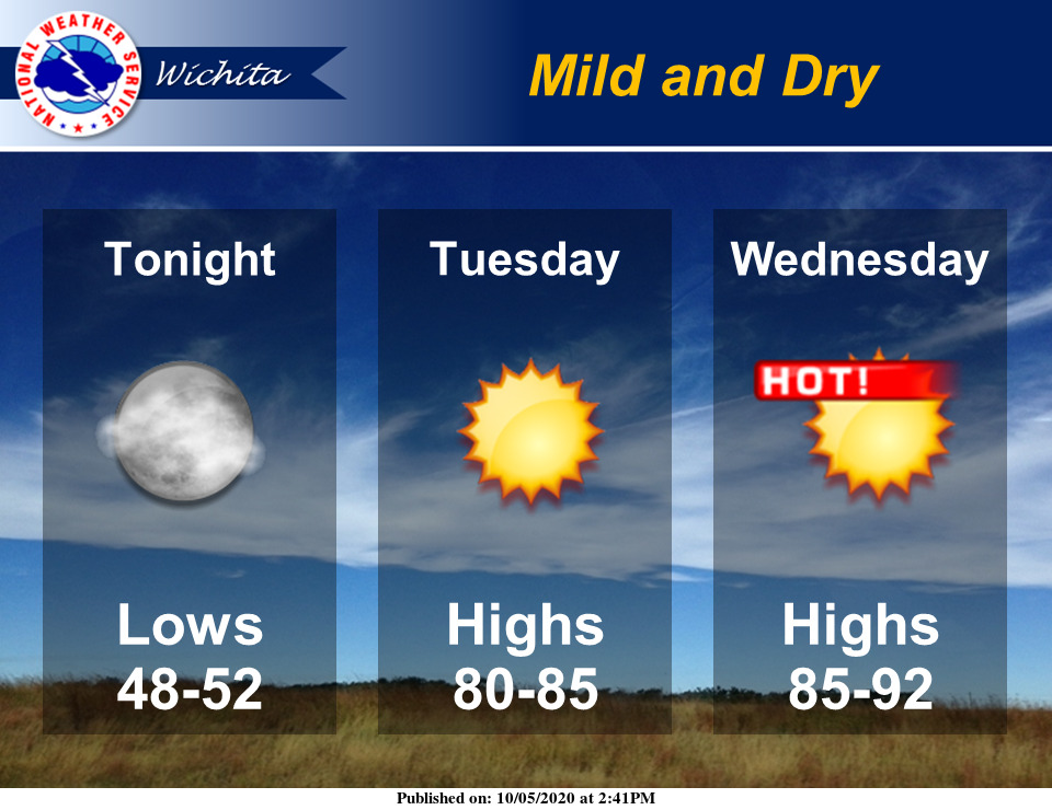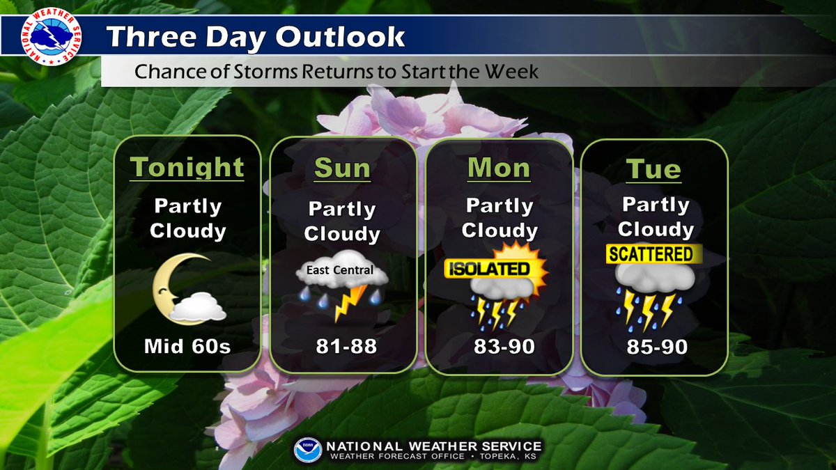 Mild temps tonight, a few storms are possible Sunday in east central Kansas, then across much of the area by Tuesday.