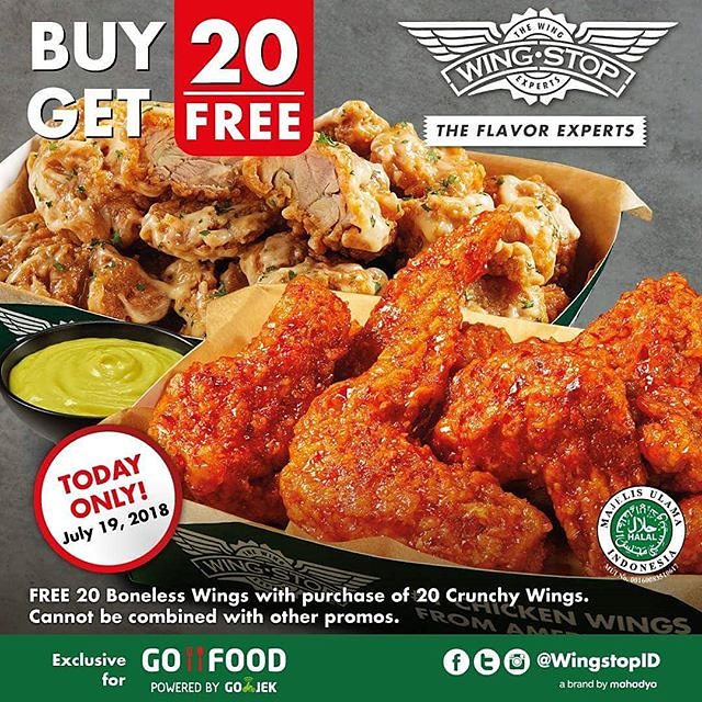 19 July Wingstop thru Go-Food app and get FREE 20 Boneless Wings with purchase of 20 Crunchy Wings Info Lengkap: https://bit.ly/2uLc91b .