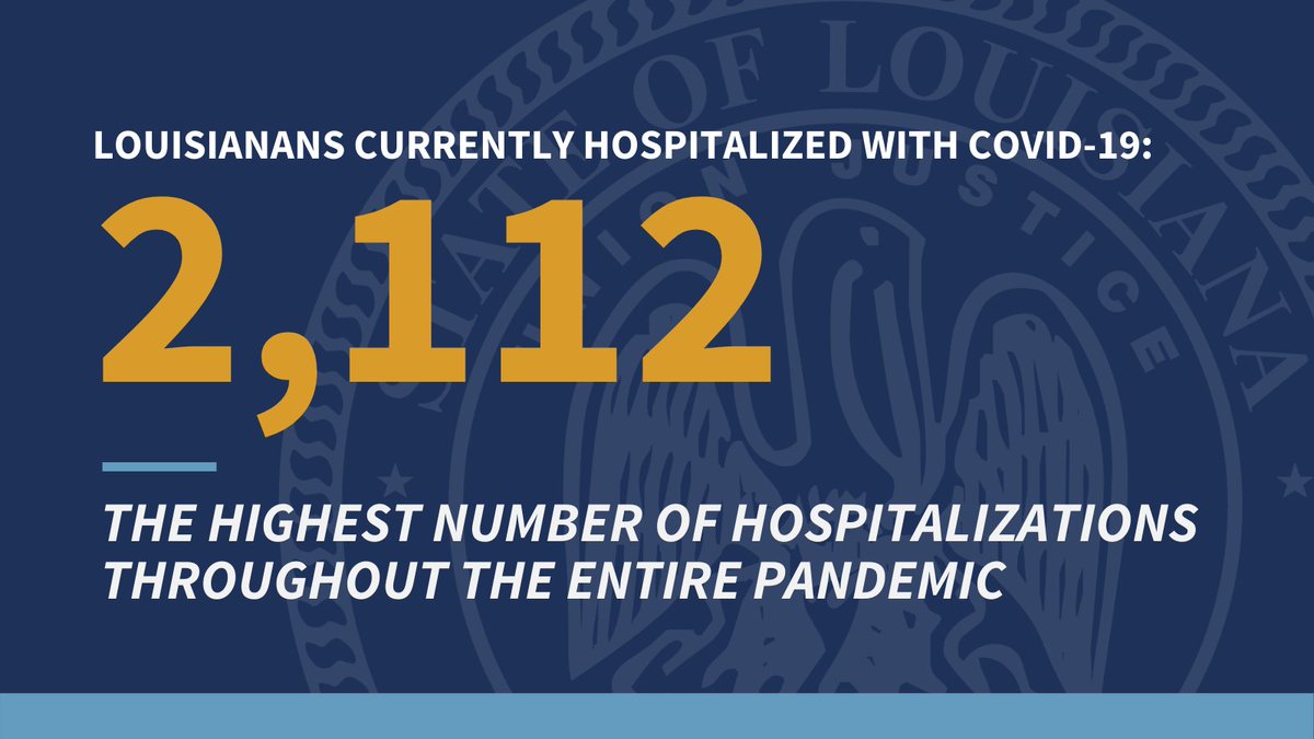 Today, Louisiana reported more people in our hospitals with COVID-19 than at any other point in the pandemic. This surge is putting a dangerous strain on hospitals' ability to deliver care. Getting vaccinated & wearing masks are simple solutions to a very serious problem.