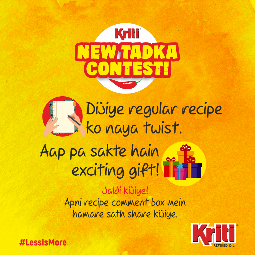 Share your unique recipe for Kriti New Tadka contest and get a chance to win exciting prizes. Share your recipe in the comment box below. _______