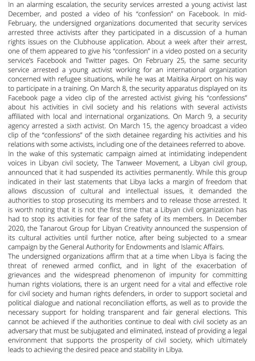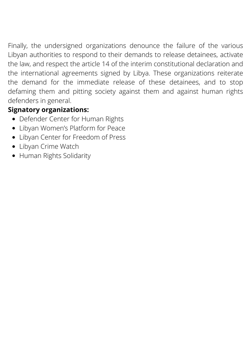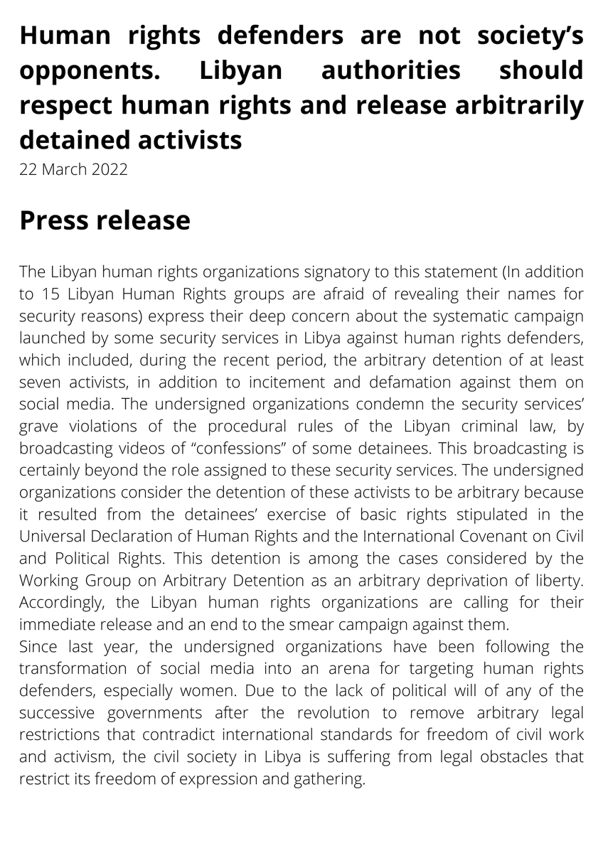 #Libya : HR defenders are not society’s opponents. Libyan authorities should respect human rights and release arbitrarily detained activists Press release - Defender Center - Women’s Platform for Peace Center for Freedom of Press Libyan Crime Watch - Human Rights Solidarity pic.twitter.com/adiVjWZmPk