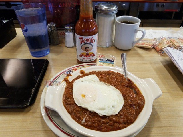 Tired of same ole slop in the mornings? Try a bowl of chili with a fried egg on top and hot sauce.