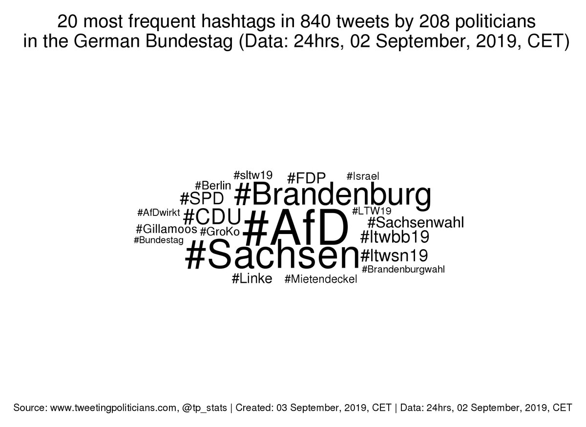 #German#Bundestag): Yesterday's 6 most frequent hashtags among members were#AfD (91),#Sachsen (80),#Brandenburg (61),#CDU (19),#ltwbb19 (15),#ltwsn19 (14). pic.twitter.com/I7e0FUVV5O