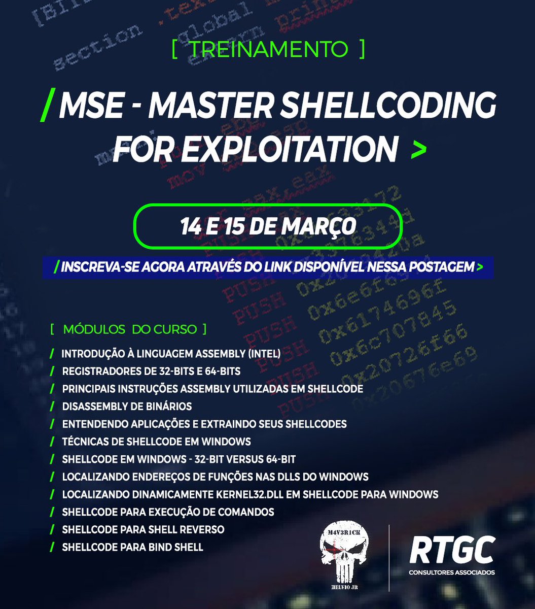 Treinamento de criação de Shellcoding (MSE - Master Shellcoding for Exploitation) presencial em SP nos dias 14 e 15 de Março. Maiores informações em: https://www.eventbrite.com.br/e/mse-master-shellcoding-for-exploitation-tickets-88866793973?aff=M4v3r1ck …
