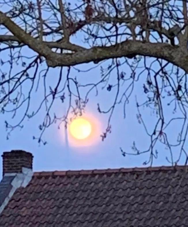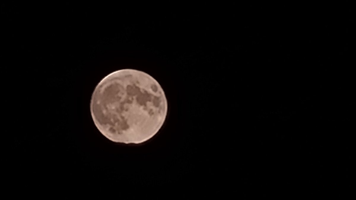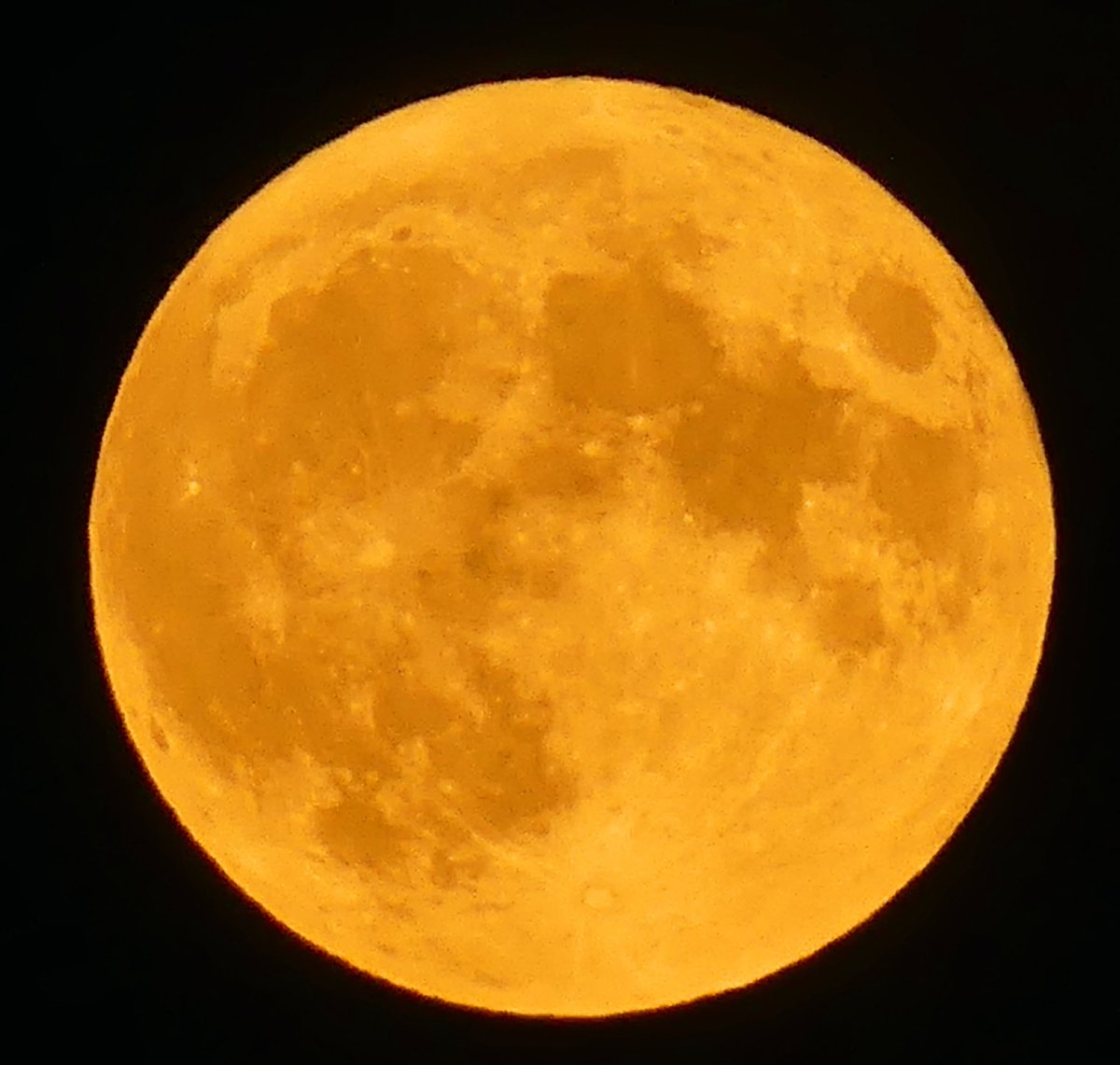 Wie nu naar het zuidoosten kijkt ziet net boven de horizon deze oranje volle maan. Ze zal niet lang meer zo oranje zijn, het is een uniek schouwspel van licht wat door de lage stand een langere afstand door de atmosfeer moet afleggen.