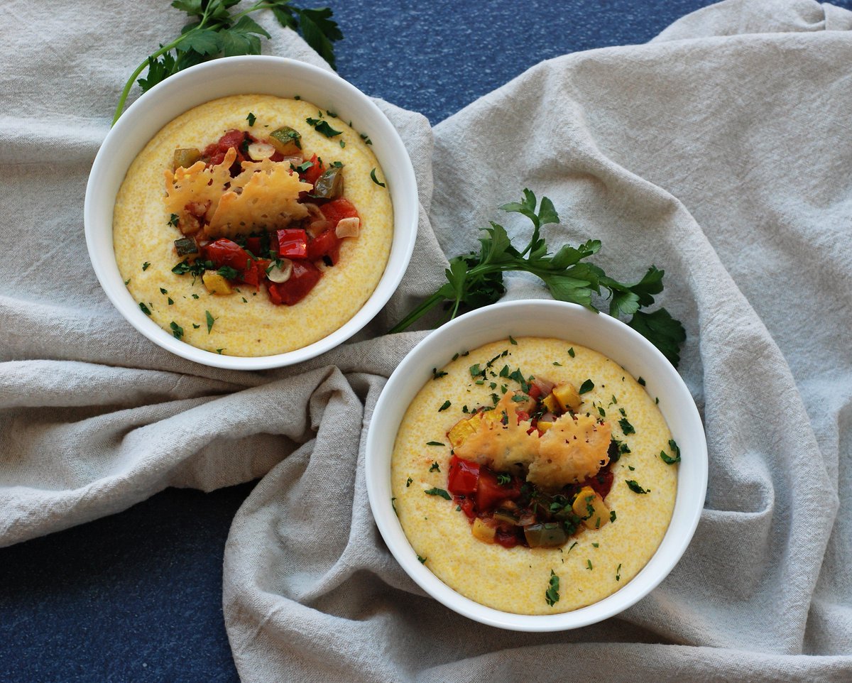 My Pisto Polenta Bowls are a delicious blend of cheesy polenta, Spanish style stewed vegetables and crispy