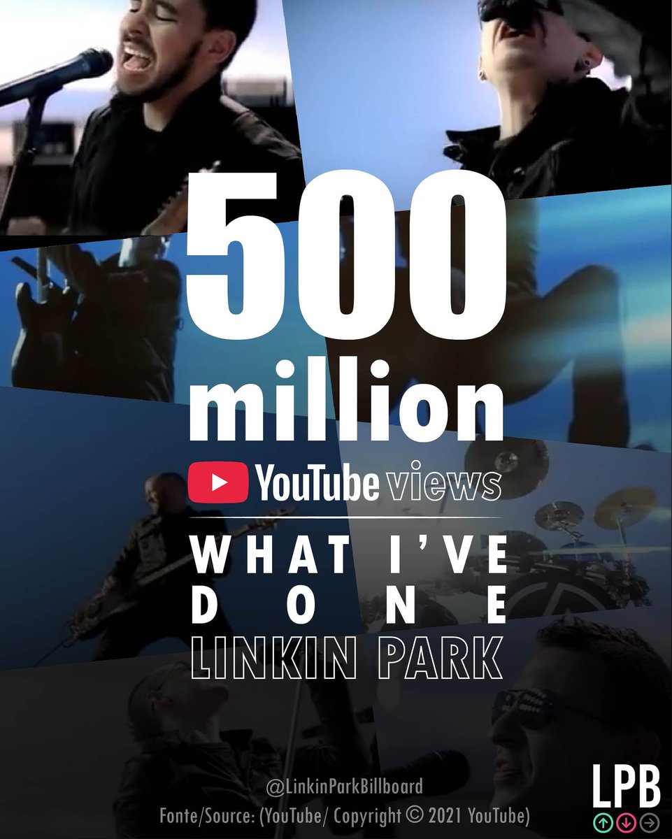 "What I've Done" video reached 500 million views on YouTube. This is the third Linkin Park video to reach this number, the others being "Numb" (1.5 Bi) and "In The End" (1.1 Bi). ○
