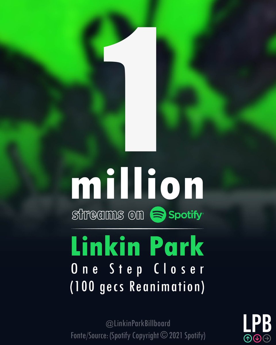 @100gecs Reanimation)'s@linkinpark reached 1 million streams on Spotify. ●#LinkinPark#100gecs#OneStepCloser#HybridTheory#HybridTheory20#MakeChesterProud#Spotify#LinkinParkBillboardpic.twitter.com/Bwoa9ysUDv