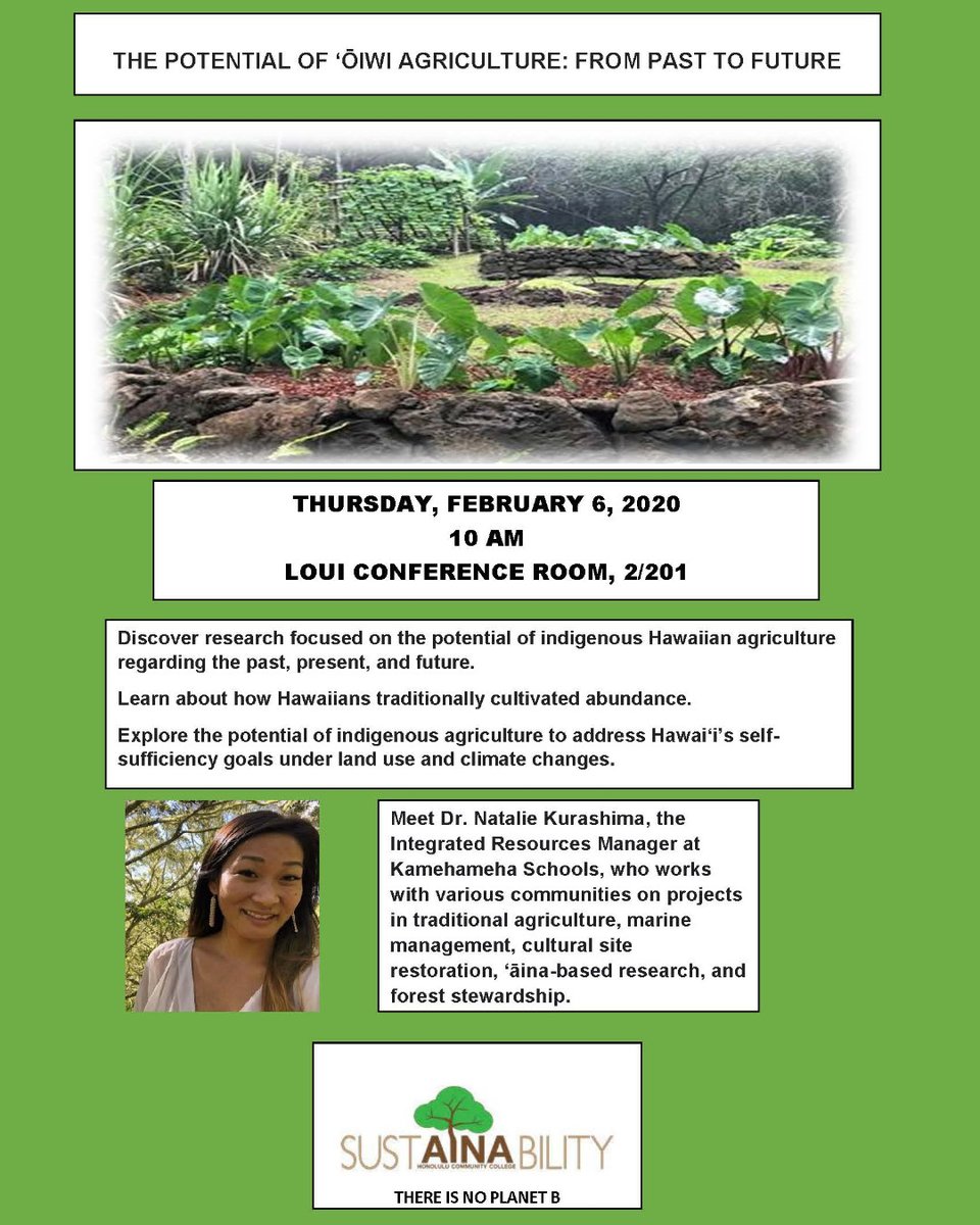@KSNews will be presenting on the potential of indigenous Hawaiian agriculture. Thurs, February 6, 2020, 10am Loui Conference Center (Bldg 2, Rm 201) Open to the public!#Sustainability#MalamaAina#WeAreHonolulupic.twitter.com/N6ZpqefBM3